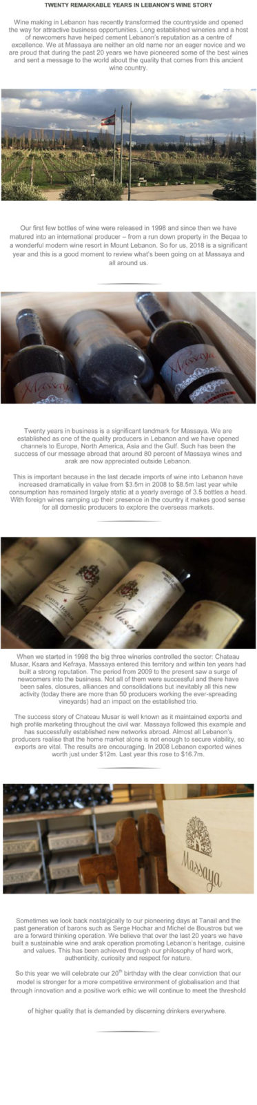 lebanontourism April 10, 2018 Lebanon Wine The beautiful facility at Faqra opened with a glamorous summer party in July 2014 and the latest exciting chapter in the Massaya story began. Spread the love